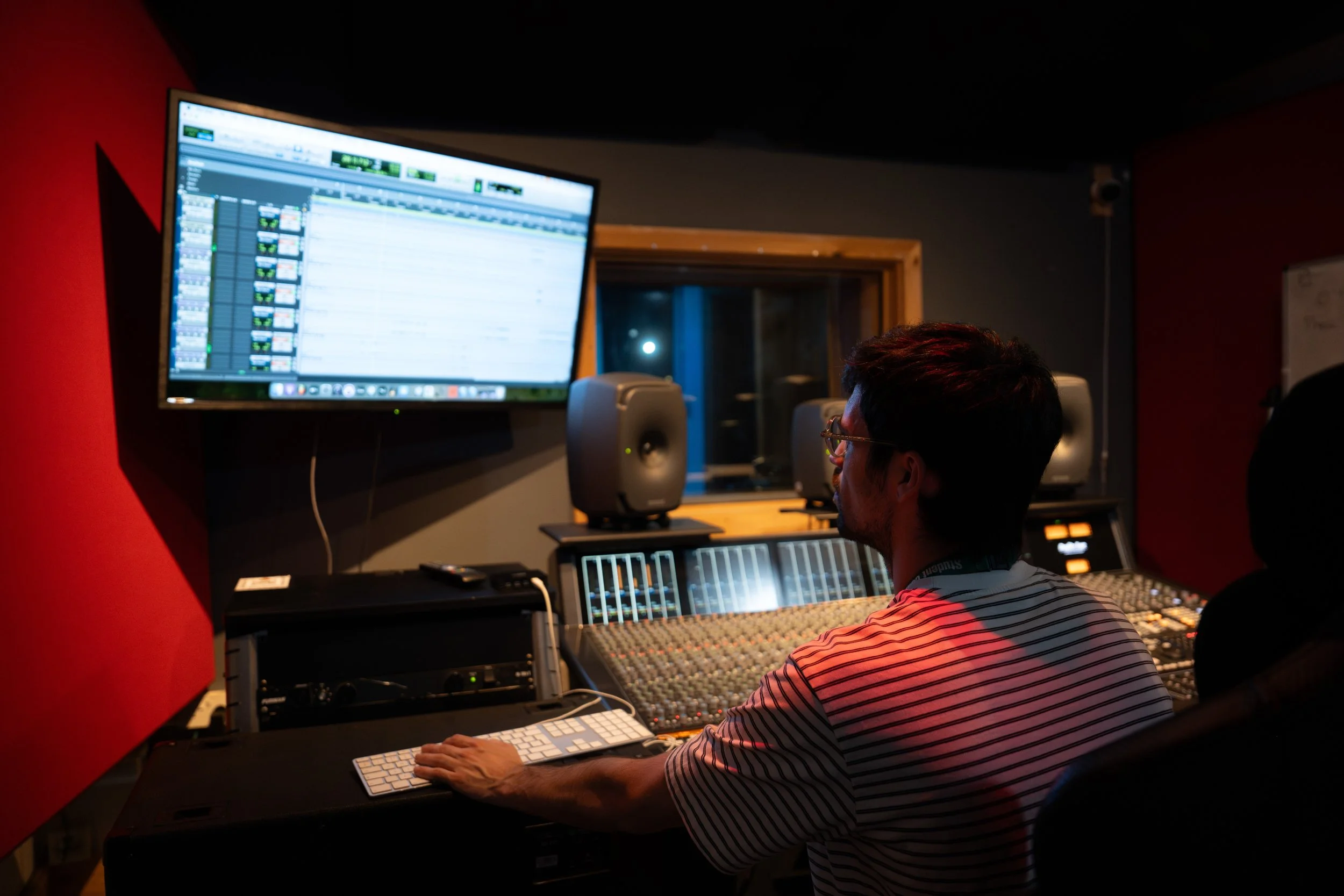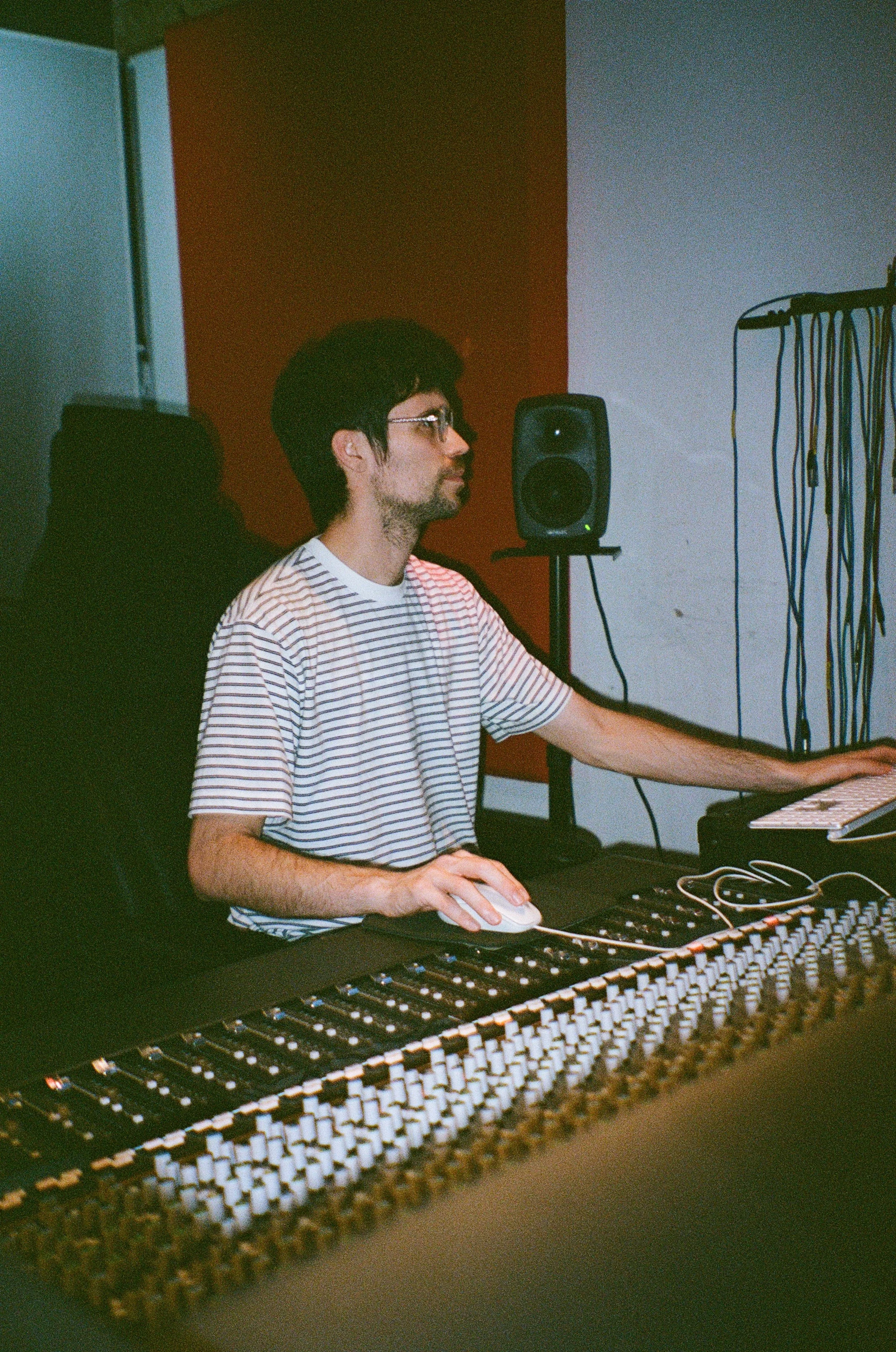 A man with glasses and dark hair working at a music mixing console in a recording studio, with a speaker and cables in the background.